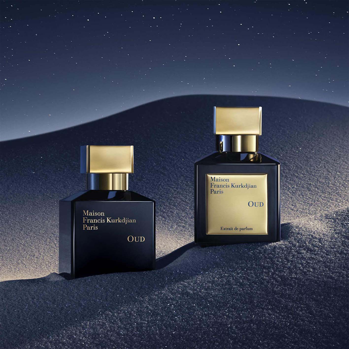 The OUD eau de parfum by Maison Francis Kurkdjian is built around the most precious of ingredients: Oud wood, dreamily imagined within a palace of sculpted gold and marble, submerged beneath a midnight blue sky filled with stars.